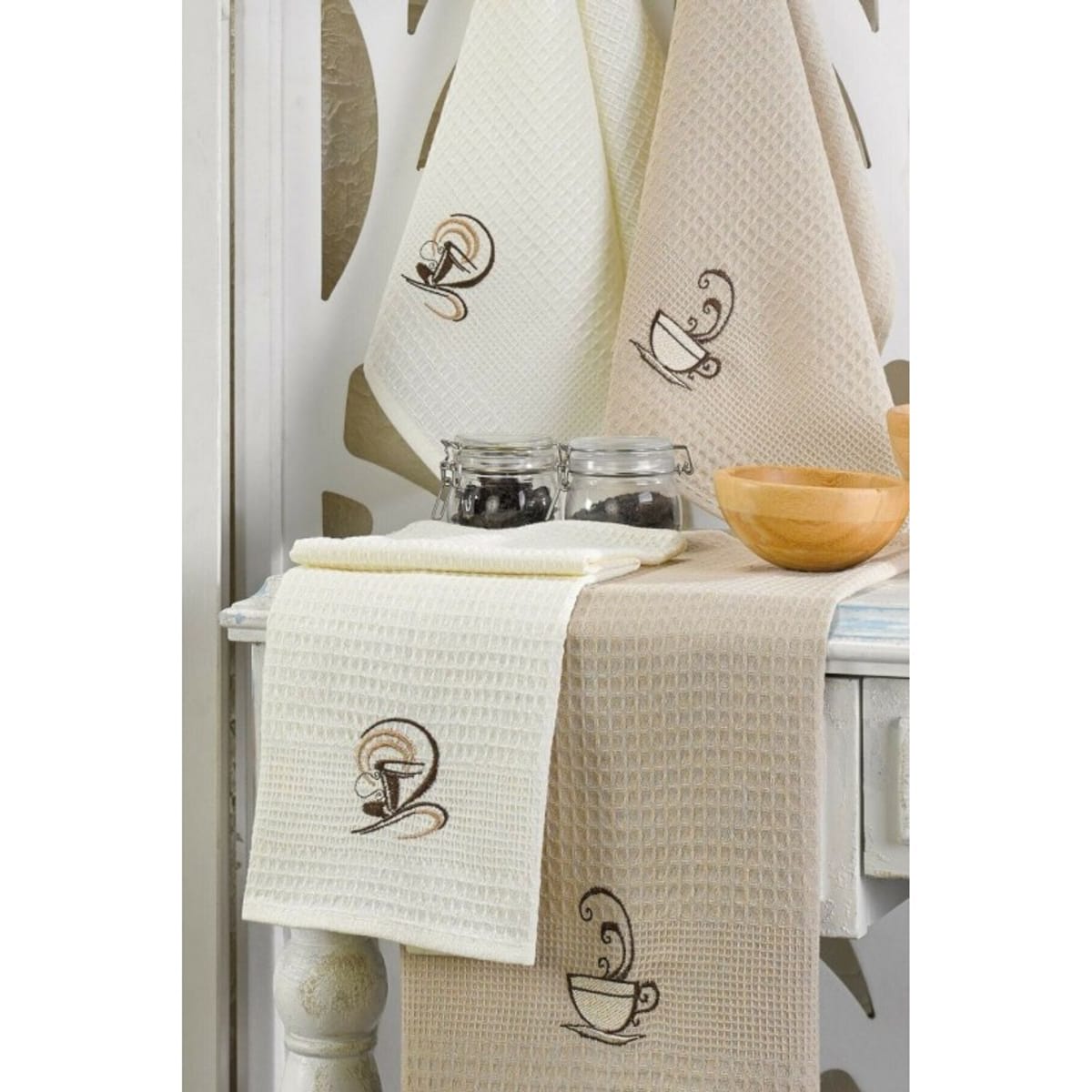 Пакет от популярните кухненски кърпи кафе с бродерия. Кърпите са вафлени, изработени са от 100% памук и са популярни на пазара. Предпочитани са много от домакините, десенът е супер свеж, а материята мека и приятна. Кърпите комбинират бежово-кафявата гама, която освен автентична за кафето, а и много модерна в момента.
