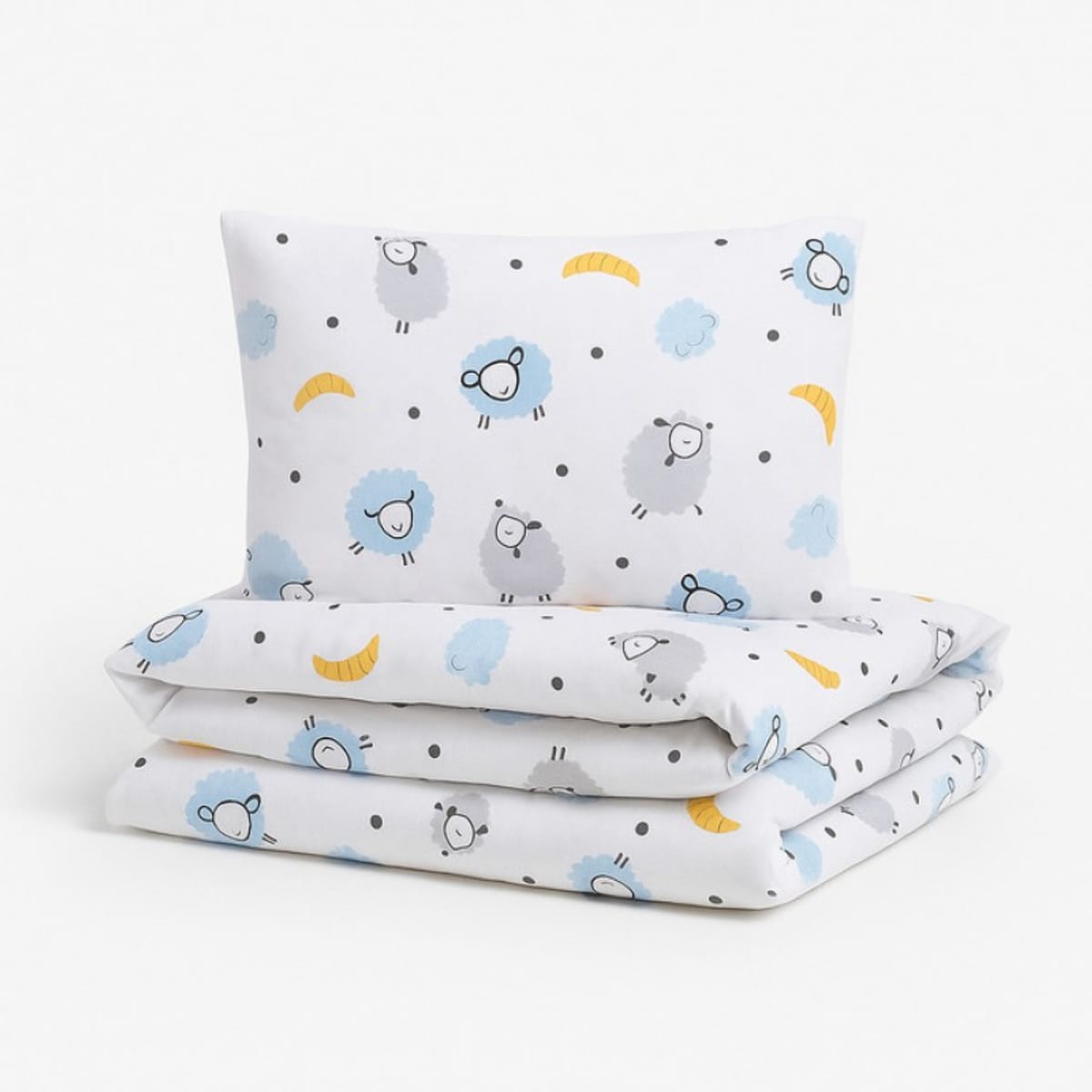 Бебешки спален комплект Овчици – 100% фин памук, мекота и уют за спокоен сън Подарете на своето дете комфорт и нежност със спалния комплект “Овчици”. Създаден от мек и фин 100% памук, той е идеален за чувствителната детска кожа и осигурява спокоен и дълбок сън през всяка нощ.