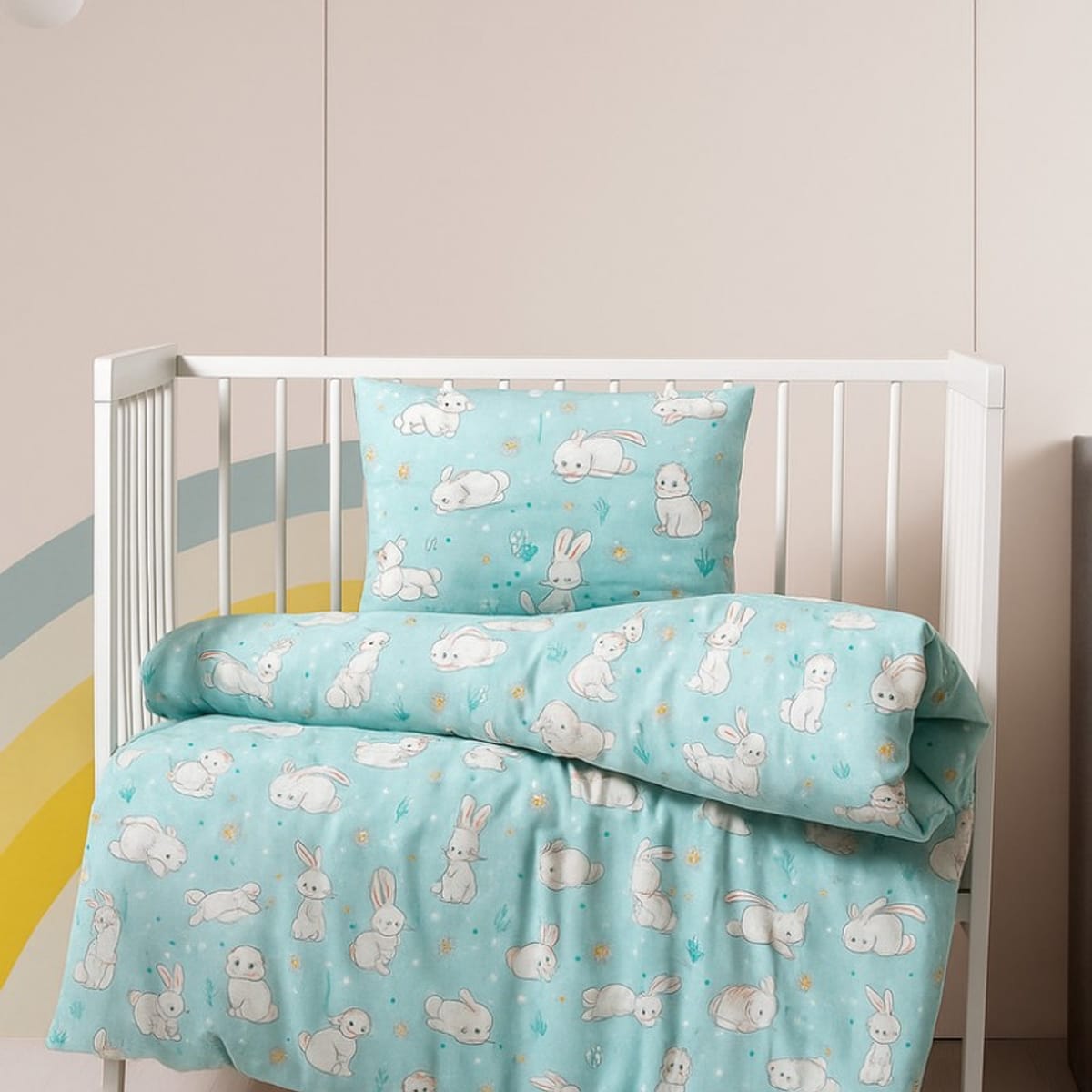 Бебешки спален комплект Сладки Зайчета – 100% памук за мек и спокоен сън Създайте уютна и спокойна атмосфера в бебешката стая с нежния бебешки спален комплект “Сладки Зайчета”. Десенът в небесносин цвят с весели бели зайчета носи усещане за чистота, нежност и топлина – идеален избор както за момче, така и за момиче.