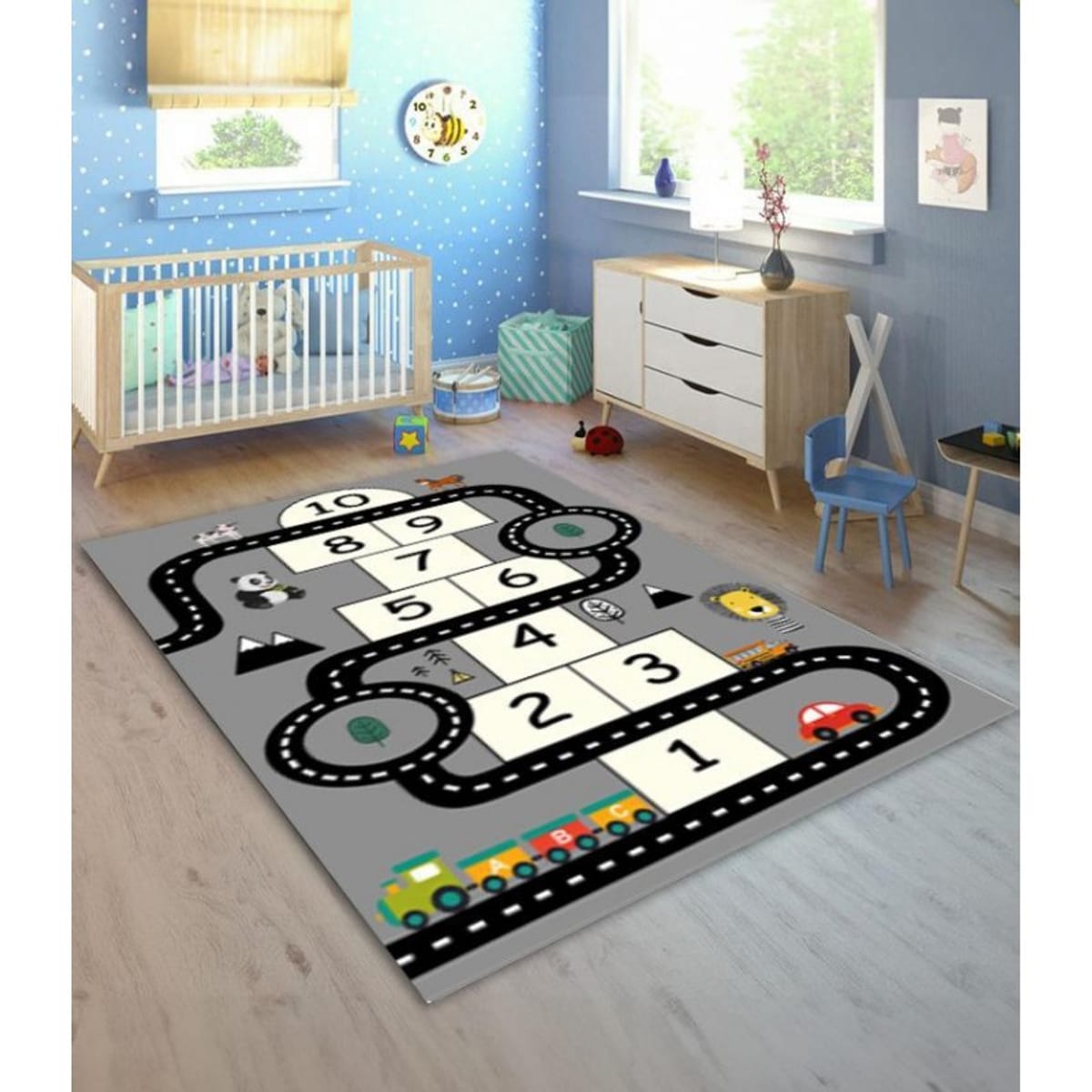Превърнете детската стая в място за игри и обучение с нашия забавен детски килим, който е подходящ както за момчета, така и за момичета. Този уникален килим идва с аутобан игра за колички, проектирана да забавлява и същевременно да насърчава развитието на полезни умения. С ярки цветове и атрактивна визия, той е перфектен за часове на творческа игра. Изработен от висококачествени и безопасни за децата материали, килимът е здрав, лесен за поддръжка и удобен. Идеалното допълнение за всяка детска стая, което съчетава забавлението с ползотворната игра!