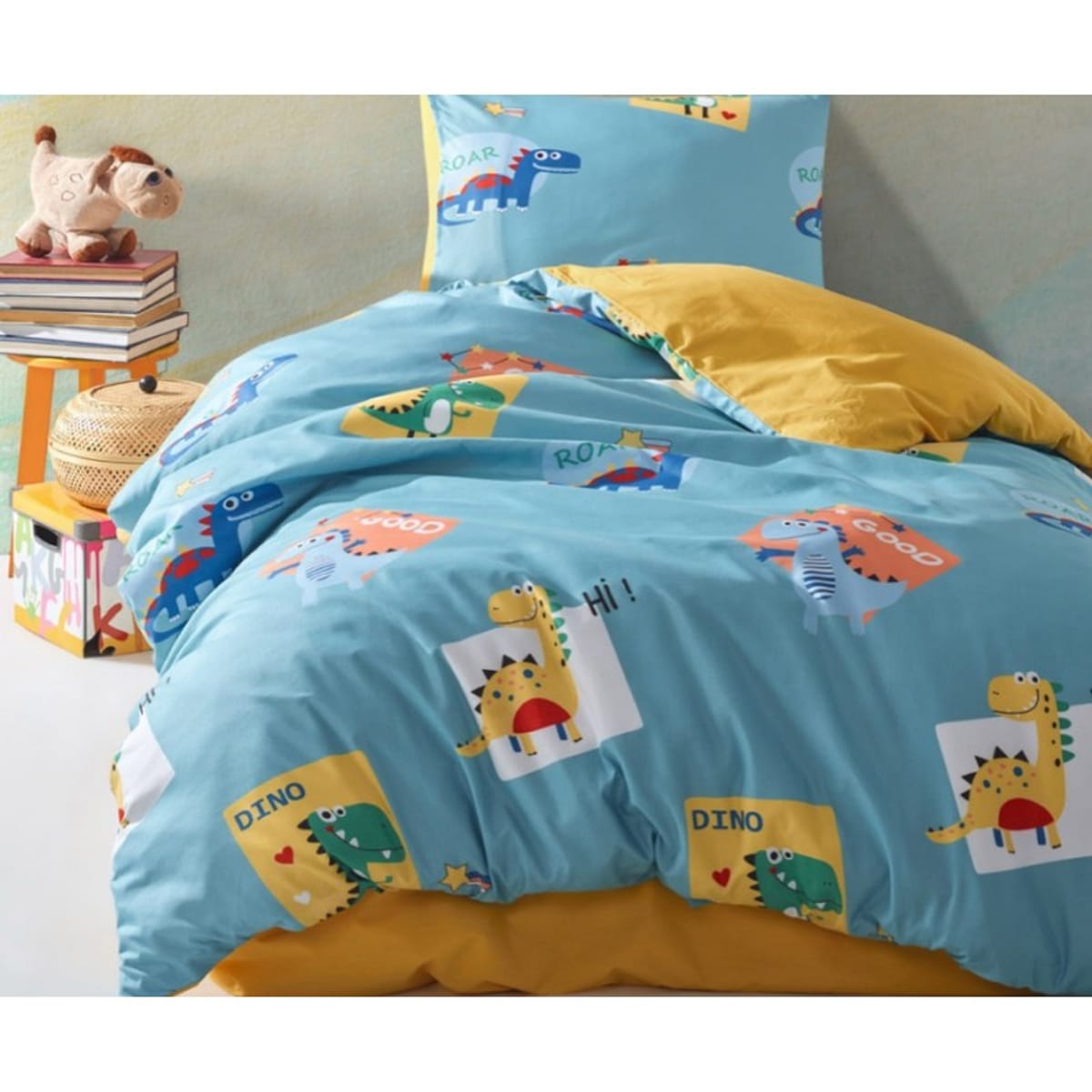 Начало / Продукти / Детски спални комплекти / Единично спално бельо ранфорс Дино аква