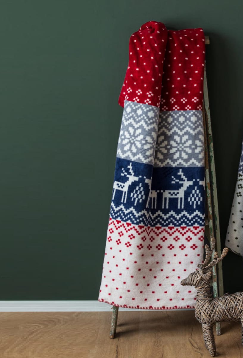 Десенът е вдъхновен от скандинавските мотиви – елени, снежинки и геометрични фигури в стилни комбинации от червено, синьо, сиво и бяло. Този празничен дизайн внася коледен дух и топла атмосфера във всяко помещение.