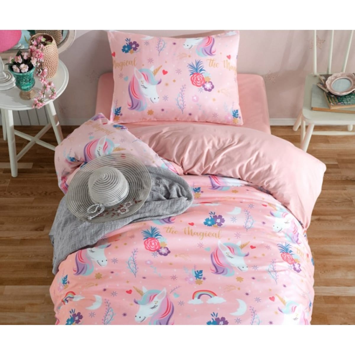 Спално бельо с еднорог в розово, страхотен дизайн в комбинация с мека и нежна памучна материя. Тъканта е дишаща и гарантира удобство при използване. Цветовете са наситени като правят декора на спалнята наистина страхотен и зашеметяващ. Продуктът се предлага в стандартни размери за единично легло като самият плик е двулицев. Изработката е много професионална като марката е гарант за сигурност.